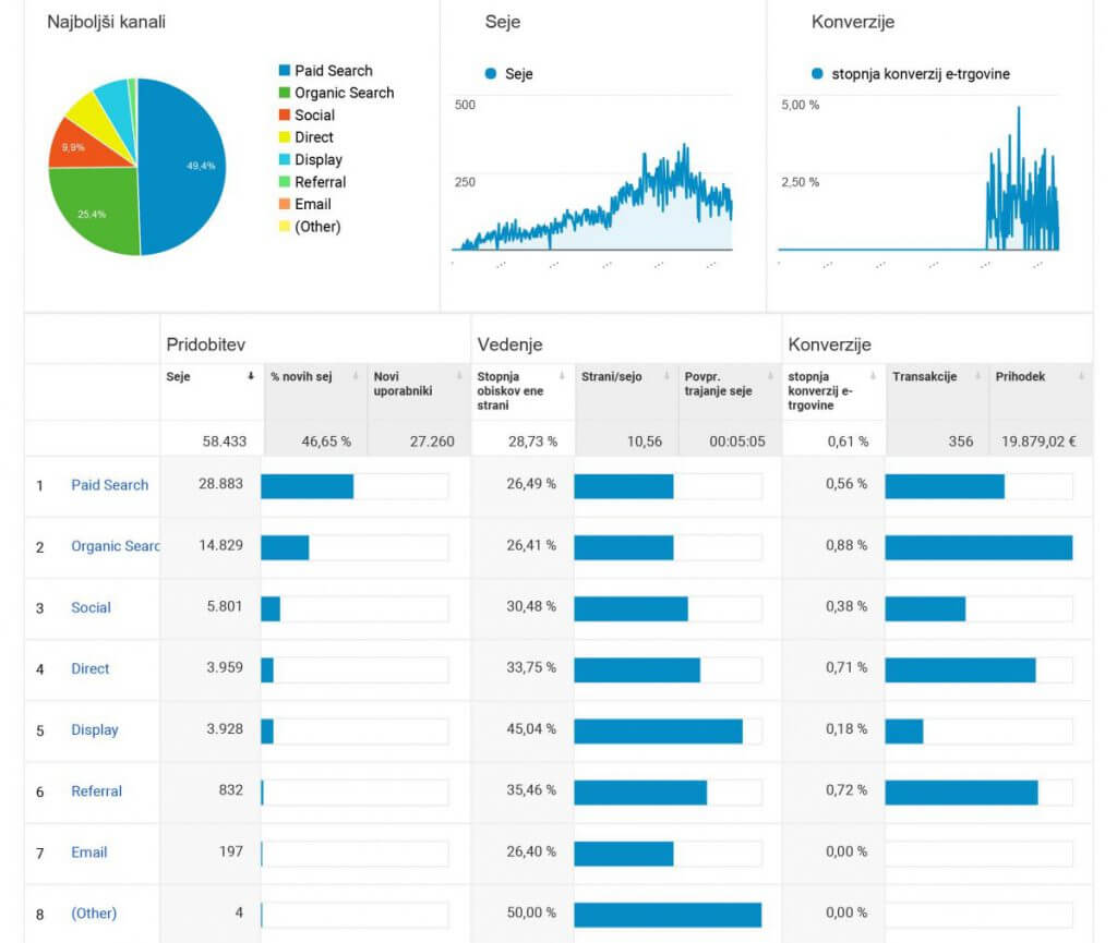 Spodnja slika prikazuje uspešnost v prodaji za posamezne vire prometa. Stopnja konverzij za organski promet je praviloma (pri večini) višja od stopnje konverzij za plačan in social.